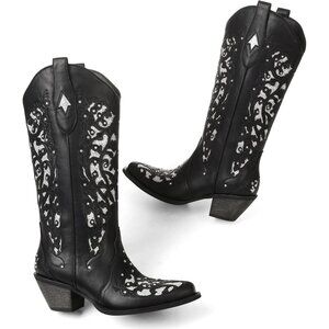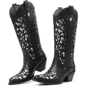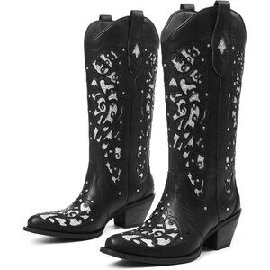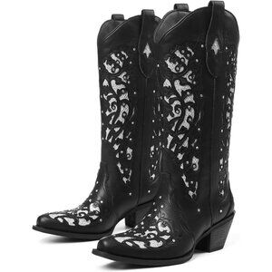 Fashion Style: The feature of the black cowgirl boots are chunky heel, pull on, pointed toe and rhinestones.