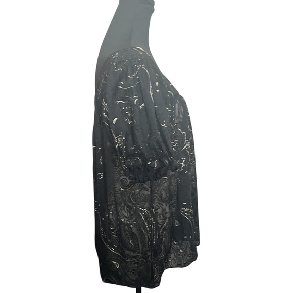 Chic black blouse with paisley pattern. Features short sleeves and tie details. Perfect for versatile styling.