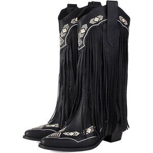 ⚡Women's Black Embroidered Fringe Pull On Mid Calf Block Heel Pointed Toe
