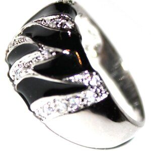 Womens Black Enamel Clear Cz Cubic Zirconia Zebra Striped Band Silver Ring 6