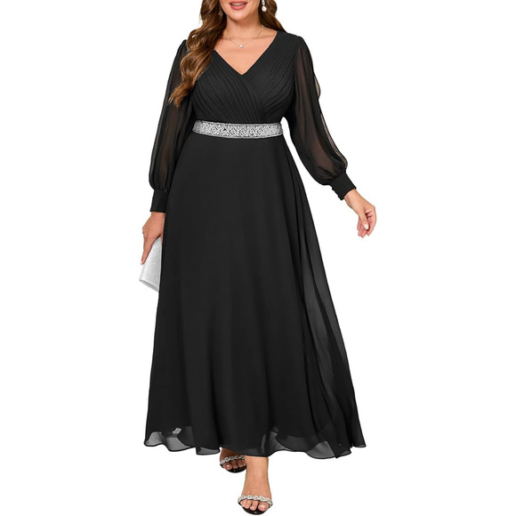 ELEGANT BLACK CHIFFON EVENING GOWN, BEADED EMBELLISHMENT DETAIL, SHEER LONG SLEEVE ILLUSION, FORMAL COCKTAIL PROM ESSENTIAL, FLOWY A-LINE MAXI SILHOUETTE, ROMANTIC WEDDING GUEST GLAM, PLUS SIZE 18 INCLUSIVE FIT, SPARKLE BEADING BODICE, ETHEREAL SHEER MESH SLEEVES, TIMELESS WARDROBE STAPLE, MACHINE WASH GENTLE, URBAN SOPHISTICATED ELEGANCE, FESTIVAL HOLIDAY READY, SOFT CHIFFON DRAPE MOVEMENT, FLATTERING EMPIRE WAIST OPTION, DELICATE BEADWORK ACCENT, LUXE EVENING WEAR, STATEMENT FORMAL DRESS, COQUETTE GLAM VIBES, EFFORTLESS TWIRL DESIGN.