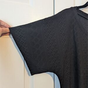 women’s eyelet top medium, black ruched tee, casual summer shirt, crew neck eyelet blouse, side ruching shirt, flowy black top