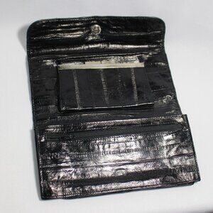 This unbranded black faux leather tri-fold wallet measures 8 inches by 4 inches when folded and 8 inches by 10 inches with unfolded. It features a magnetic snap closure and a kiss-lock clasp on the internal coin pocket. There are three internal lined bill pockets and one zippered pocket which is also lined. This wallet is pre-owned and in good condition.