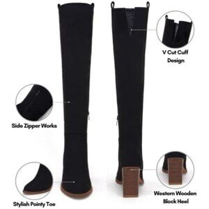 Features: Over knee fashion boots for women, pointy toe, stacked chunky block high heel, faux suede, slip on, wide calf. Stretchy materila, made with a full elasticated leg for most shape calf fitting as possible