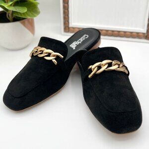 These black mules from Corkys have a soft faux suede upper and a slip-on design. They feature a gold chain detail across the top and a cushioned insole for all-day comfort.