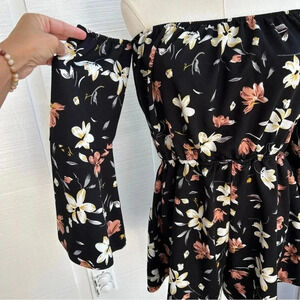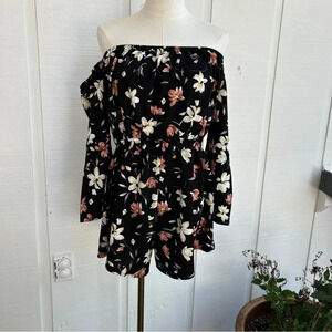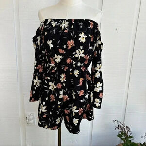 Women’s Black Floral All Over Print Bell Sleeve Off The Shoulder Romper Dress