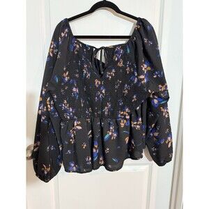Women’s Black Floral Blouse Boho 2X Peasant Ribbed Plus Long Sleeve