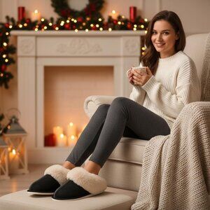 WARM AND COMFORTABLE-Warm and breathable upper with comfortable fluffy lining that gently wraps your feet for extreme warmth and comfort.Eco-friendly thick plush fluffy and breathable cotton keeps away from coldness.Fine outer and chic color make these house womens slippers lovely