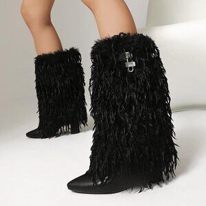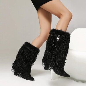 ⚡Women's Black Fold Over Faux Fur Mid Calf Boots Chunky Heel Point Toe