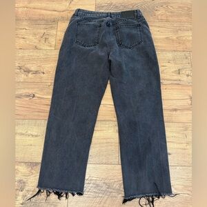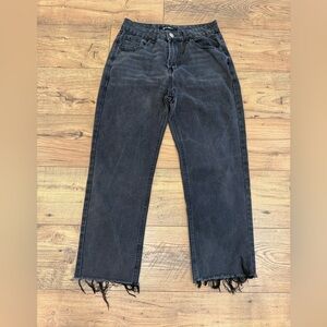 Elevate your style with these chic black straight leg jeans. Featuring a trendy frayed hem, they offer both comfort and a modern look.