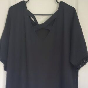 Women's black fringe hem and sleeve short sleeve sweater with cross cut out on back detail. This is new without tags never worn. Size is 3XL - measurements: 25" across, 29" long, 12" sleeves.