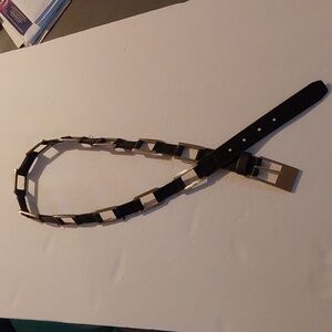 Stylish black leather belt featuring sleek silver links with Silver buckle. Perfect for any occasion.