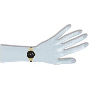 Mineral crystal lens glossy black dial with genuine diamond at 12; gold-tone hands and markers