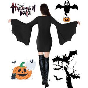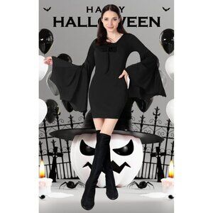 Women's Black Halloween Long Wide Sleeves Addams Costume Wrap Gothic Witch Dress