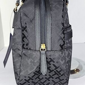 TOMMY HILFIGER women's black handbag with gold hardware, 11" wide, 9" deep inside of handbag, logo on front of handbag and inside of handbag, zipper pockets inside with and open pocket, NWT, smoke-free home.
