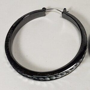 These hoop earrings are the perfect combination of classic and contemporary style. The earrings feature a sleek black color and a polished finish that exudes sophistication and elegance. The silver-tone discs surrounding the hoop add a touch of modernity and texture to the overall look. NWOT