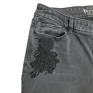 Stylish women's WHBM black jeans featuring elegant embellishments. Perfect for a chic and modern look.