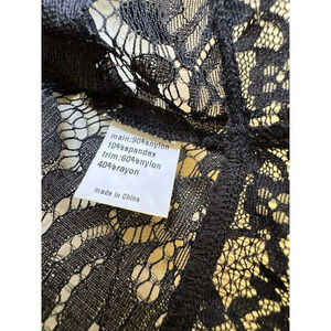 This is a women's black lace cropped cardigan in size medium. It features a gothic style with a floral lace pattern, short sleeves, and a regular fit. The blouse is made of a blend of spandex, nylon, and rayon, with a fabric type of lace.