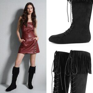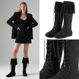 ⚡Women's Black Lace Up Suede Knee High Flat Boots with Zipper Mid Calf
