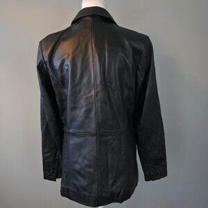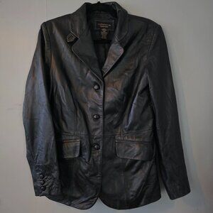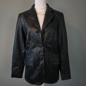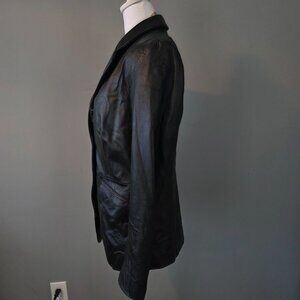 Beautiful 100% leather black leather jacket in a blazer style from Croft & Barrow. Notched collar, front pockets, three button closure and button cuff detail. Buttons are a basketweave pattern. One cuff is missing a button- see pictures. This coat is in beautiful condition with no rips, tears, or stains. The leather is in excellent condition with no signs of wear or fading.
