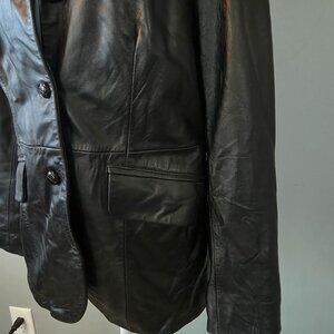 Women's Black Leather Jacket Blazer. Button Front. Long Sleeves. Size Small.