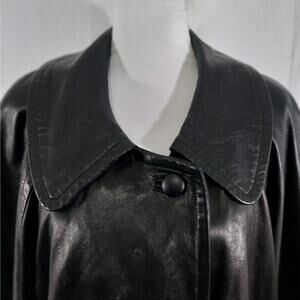 sleek vintage black leather swing coat with cute buttons and collar. has a vintage leather smell so i’m reposting for low. open to offers :)