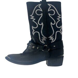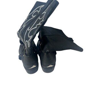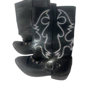 black cowboy boots, studded boots women, metal toe boots, block heel boots, western wear shoes, women’s tall boots, rugged women’s boots, cowboy style boots, western leather boots, silver embroidered boots, black leather footwear, western style footwear, silver detailing boots