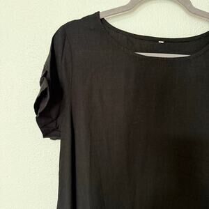Women's Black Linen Blend Asymmetrical, Hanky Hem Short Sleeve Dress Size Large. Linen, cotton fabrics. Approx. measurements pit to pit 19.5 in. Waist 42 in. Dress length 35.5 in. Pre-owned in good condition, no rips or holes.