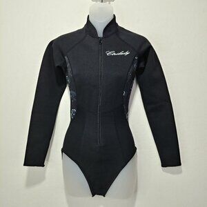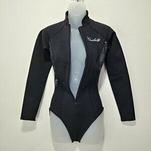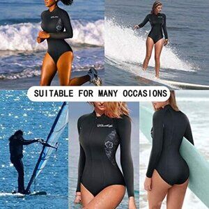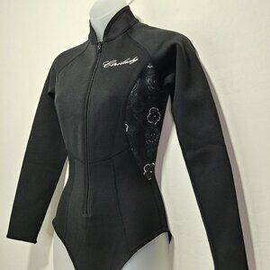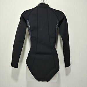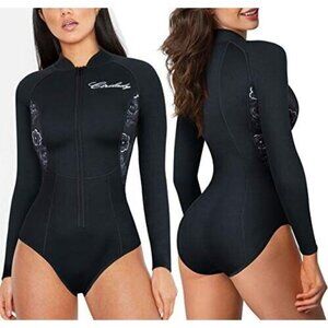 Stay stylish and protected with this sleek black long sleeve swimsuit. Perfect for surfing and beach activities.