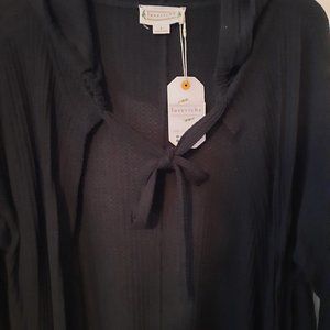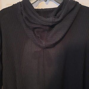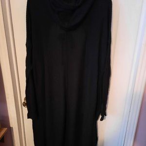 Long black ribbed cover-up. It has a hoodie and pockets just for fun. So, if you are going to the beach, think cool sunglasses, flip flops and pockets to keep your cell phone and debit card so you can grab a Coke to sip in the sun. This has never been worn. I did not swim this summer. This is just a fun piece to have in your closet. Weat it on a summer night with jeans and a tee shirt just to have a little coverup after the sun goes down. What fun!!