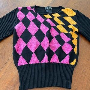 Stylish and vibrant, this sweater features a striking black base with bold pink and orange diamond patterns. Perfect for adding a pop of color to your wardrobe.