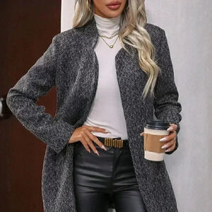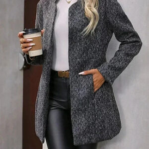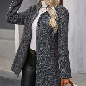 Womens Black Plaid Pattern Flap Pocket Drop Shoulder Belted Tweed Overcoat