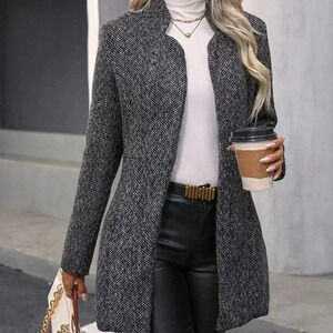 Womens Black Plaid Pattern Flap Pocket Drop Shoulder Belted Tweed Overcoat