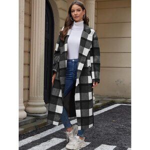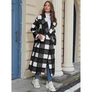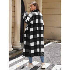 Women's Black Plaid Wool Coat Shacket Jacket Laple Button Down Trench Coats