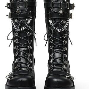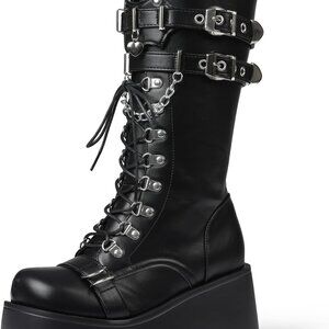 Women's Black Platform Wedge Combat Boots Chunky Heel Lace Up Mid Calf