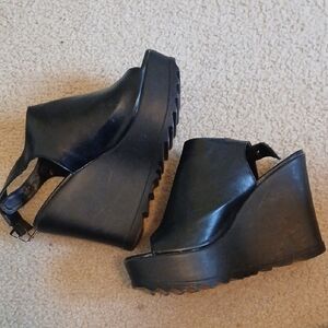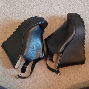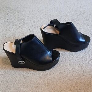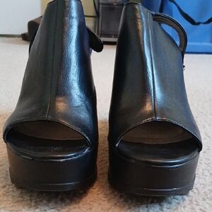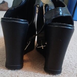 There is a minute material detail on the front toe opening (see photos). The wedge heel has same colored scuffs, which can be buffed out.