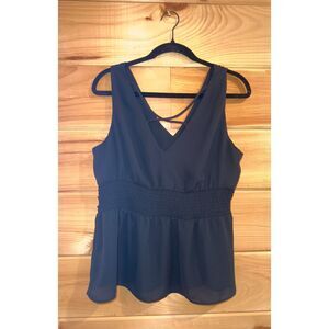 Women's black pleated tank top blouse. Perfect for work with a nice cardigan over the shoulders. Size large. Exact measurements below.