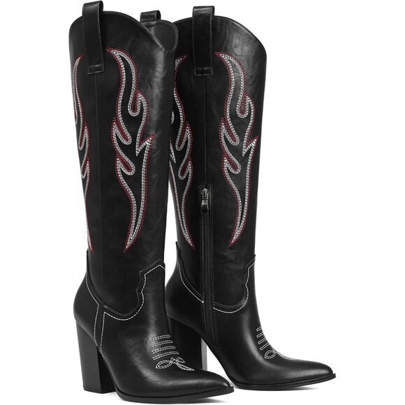 Women's Black Pu Rhinestones Embroidered Pointed Toe Chunky Heel Knee High Boots