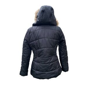 Women's Black Quilted Jacket with Faux Fur Hood size L zippered hoodie