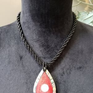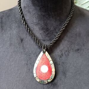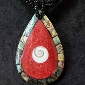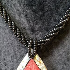 Womens Black Seed Bead Coral and Abalone Pendant Necklace with Button Closure.