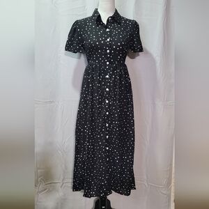 Women's Black Sheer Collared Polka Dot Short Sleeve Midi Dress Size XS EUC
