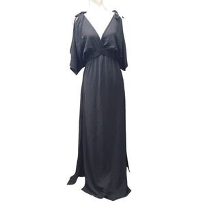 Women's Black Size XL Split-front Solid Color Loose Batwing Sleeves Deep V-Neck Maxi Dresses