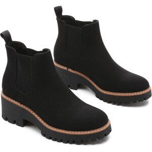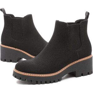 Womens Black Suede Leather Low Wedge Heel Slip On Chunky Platform Ankle Boots