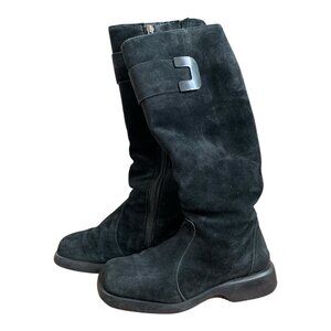 Stylish women’s black suede leather boots featuring a convenient side zip, low platform design, and cozy shearling lining for warmth and comfort. Size EU 37 fits US 6. These versatile boots pair well with casual or dressy outfits, making them a practical yet chic wardrobe staple. Pre-loved, in good condition.