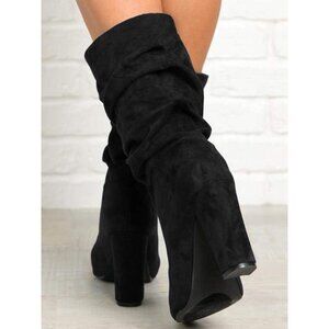 Women's Black Suede Mid Calf High Slouchy Chunky Heel Block Pointed Toe Boots
