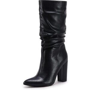 Women's Black Suede Mid Calf High Slouchy Chunky Heel Block Pointed Toe Boots