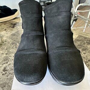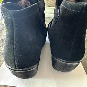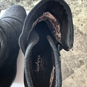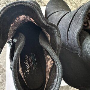 Skechers Black suede Booties. Side zipper elevated heel, cool memory foam inside. Size tag says 7.5 US 5.5 UK. They have been worn once. They are comfortable I just cannot wear elevated shoes any longer. Like new condition. The photos don't do them justice.