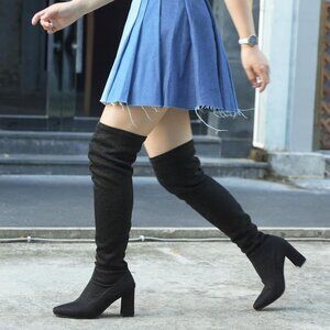 Make Your Look Stand Out:These black over the knee boots are set on a thick 3.15 inch heel. With classic point-toe and high-heel height block heels, these thigh-high boots help to show off your fashionista.