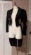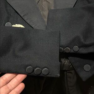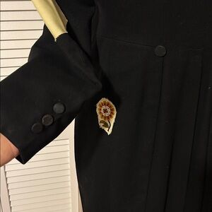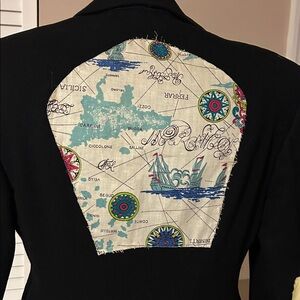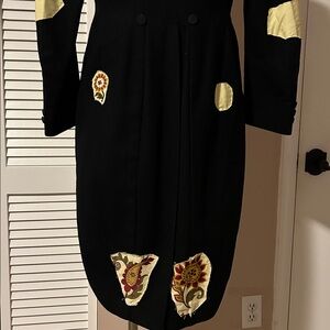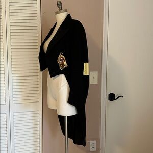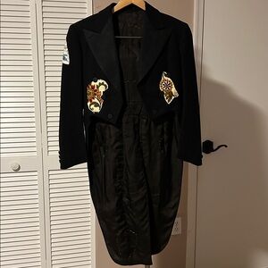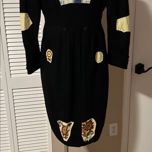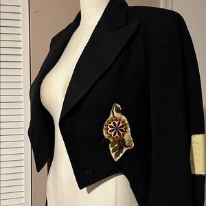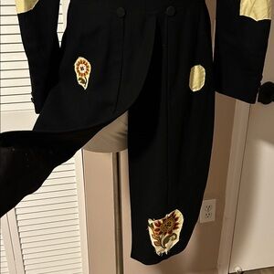Women’s black formal tailcoat jacket with custom embroidered patches, decorated with cut out cloth that could be removed. a unique, potentially steampunk or themed, costume piece.