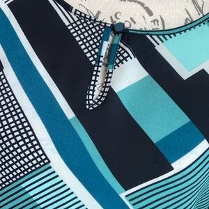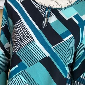Gorgeous Soft Sheer & Flows! Gorgeous Geometric Patterns in teal turquoise green & black blouse with key hole button neckline by Van Heusen Detailed with ruffle bell sleeve. Sleeves are 3/4 length! Wear casual with jeans or dress it up with dress slacks chinos cropped pants or a skirt! Size women medium